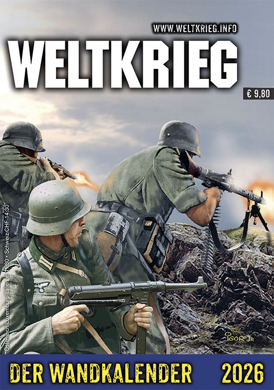Vom ersten Heft an adelte der Maler Igor jr. die Titelseiten der Weltkrieg-Hefte mit seinen eindrucksvollen Gemälden. Jedes Gemälde ein wahres Kunstwerk! Ein Maler, der von den Waffen und Uniformen des Zweiten Weltkrieges wirklich Ahnung hat – hier stimmt jedes Detail! Wir von der Weltkrieg-Redaktion fanden es schade, daß diese oft spektaku­lären Gemälde nur für kurze Zeit für das jeweils aktuelle Heft Verwendung fanden. Deshalb haben wir uns die Titelseiten aller 750 bisher erschienenen Hefte einmal aufmerksam angeschaut und für die erste Ausgabe von WELTKRIEG – Der Wandkalender 28 Motive herausgesucht. Es ist ein Kalender der Superlative geworden! Im Original­format der Weltkrieg-Hefte zeigt sich der Kalender als neuer, würdiger Teil der WELTKRIEG-Familie mit ihren sieben Reihen Originalband, Doppelband, Großband, Flieger, Marine, Soldaten und Magazin. Jetzt schmücken wir unsere Wand mit den unvergleichlichen Gemälden von Panzern, Flugzeugen und Schiffen, von MG-Trupps, Panzervernichtungstrupps, von Kradschützen und Gebirgsjägern. Jeden Tag grüßen sie uns von der Wand, unsere todesmutigen deutschen Landser und ihr Beispiel von Treue und Kameradschaft.